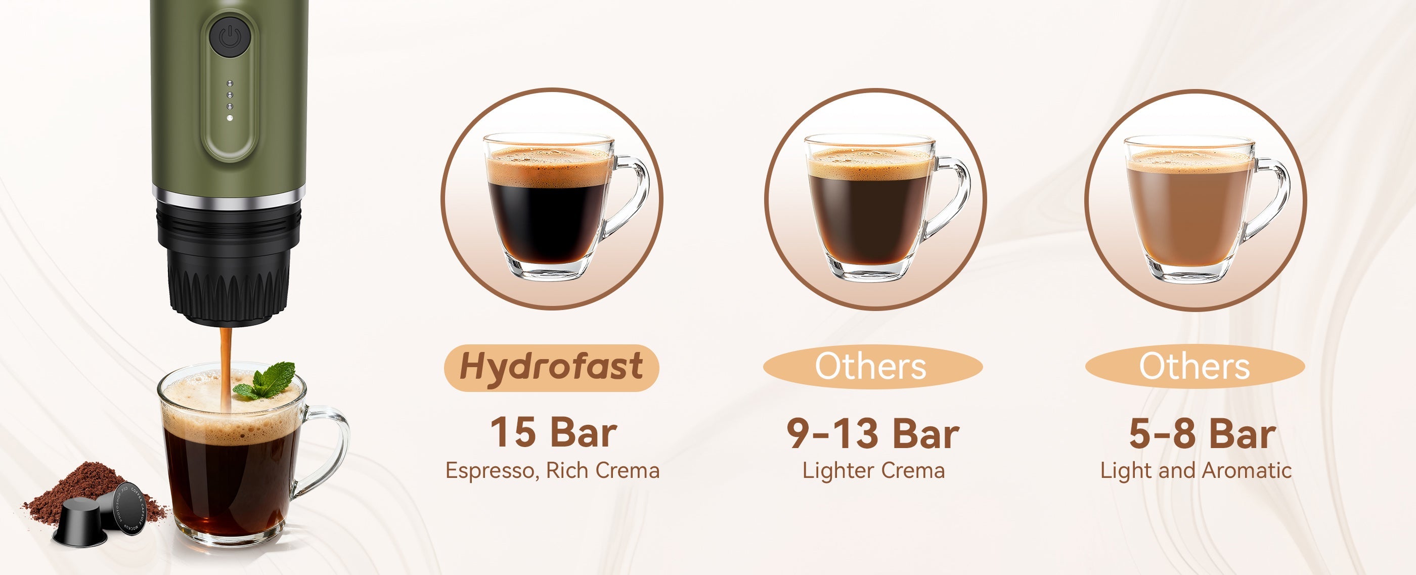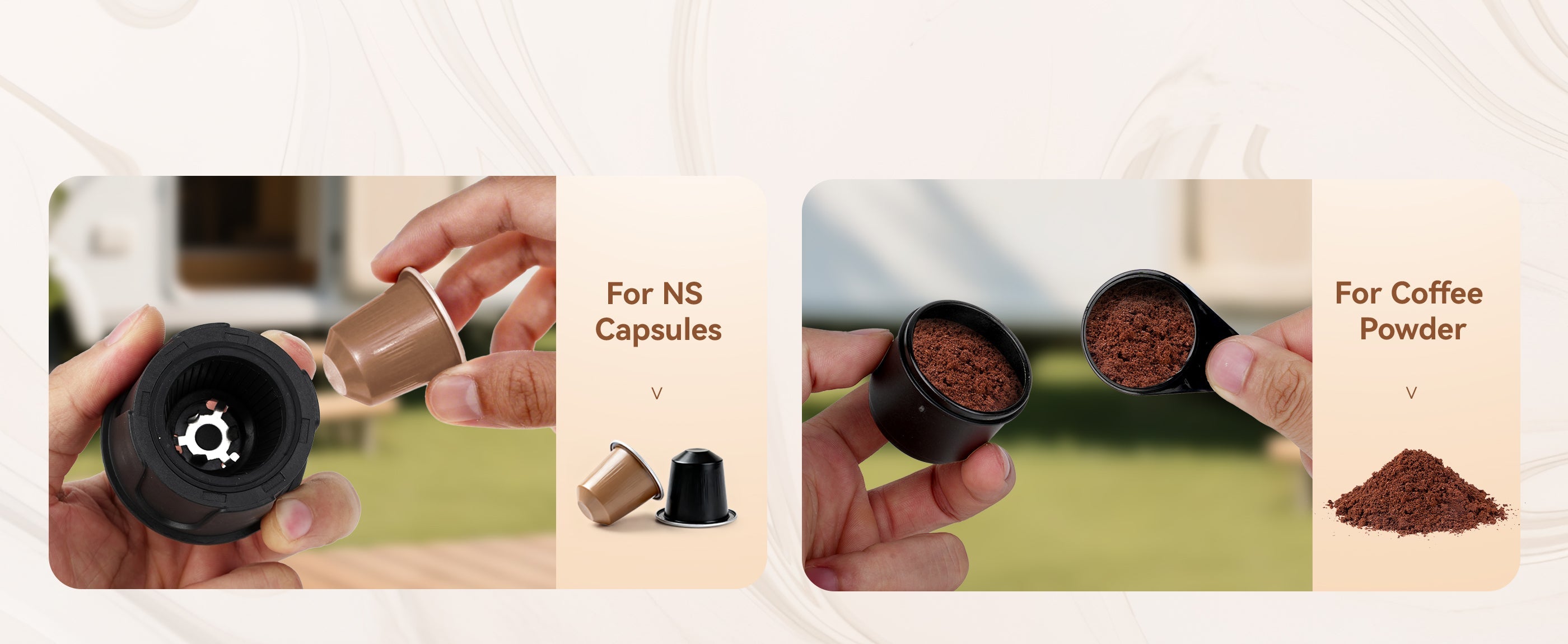 2-in-1 Portable Espresso Machine: Compatible with ground coffee and coffee capsules to meet diverse needs. Features dual modes (heated extraction and direct extraction) for brewing rich, authentic espresso.